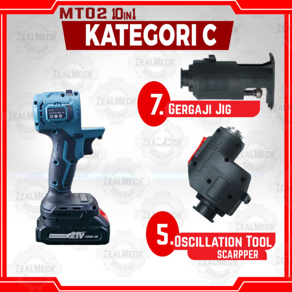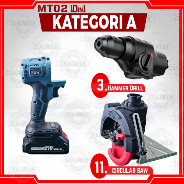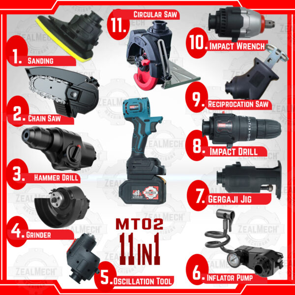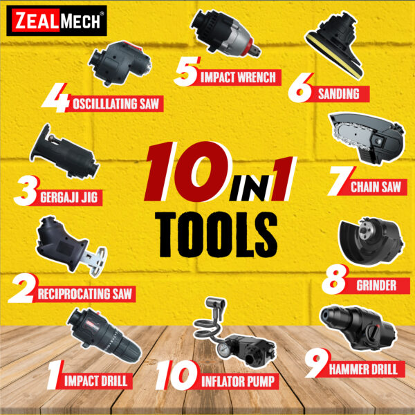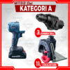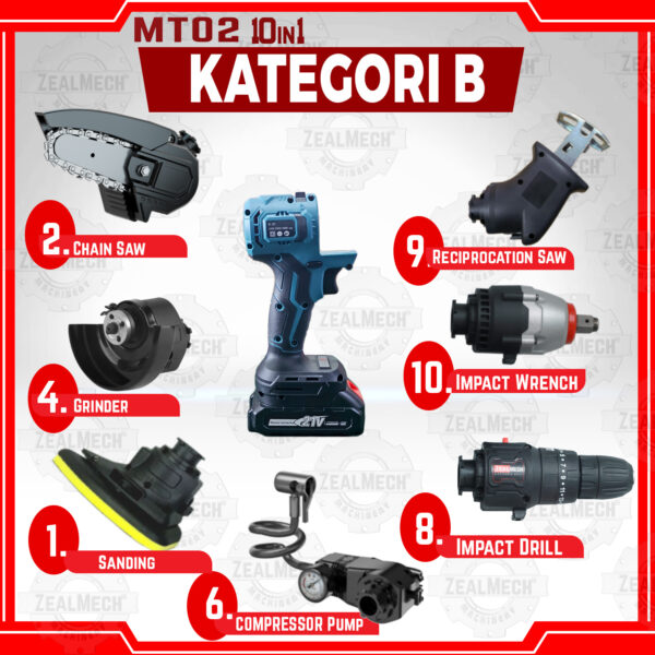 1. DRILL – IMPACT (KHUSUS BUKA SKRU), 2. DRILL – WRENCH (KHUSUS BUKA NUT KETAT), 3. DRILL – HAMMER (KHUSUS TEBUK DINDING), 4. SAW – CHAIN SAW 4INCH, 5. SAW – RECIPROCATING, 6. SAW – JIG SAW, 7. SAW – OSCILLATING/SCRAPER, 8. GRINDER, 9. SANDING, 10. COMPRESSOR PUMP, 11. CIRCULAR SAW